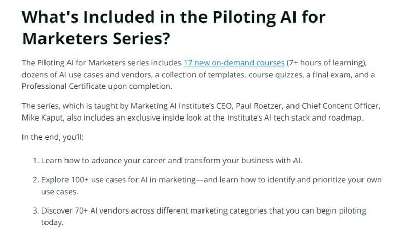 These training options cover separate parts of the marketing process. One might teach you how to introduce a new product. Another focuses on fine-tuning performance with data or putting new AI strategies into practice.